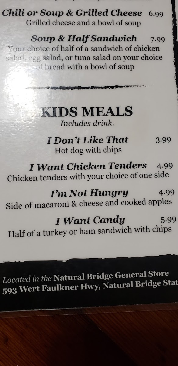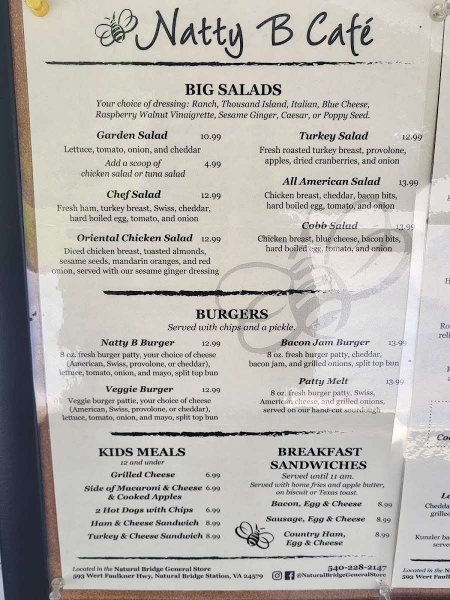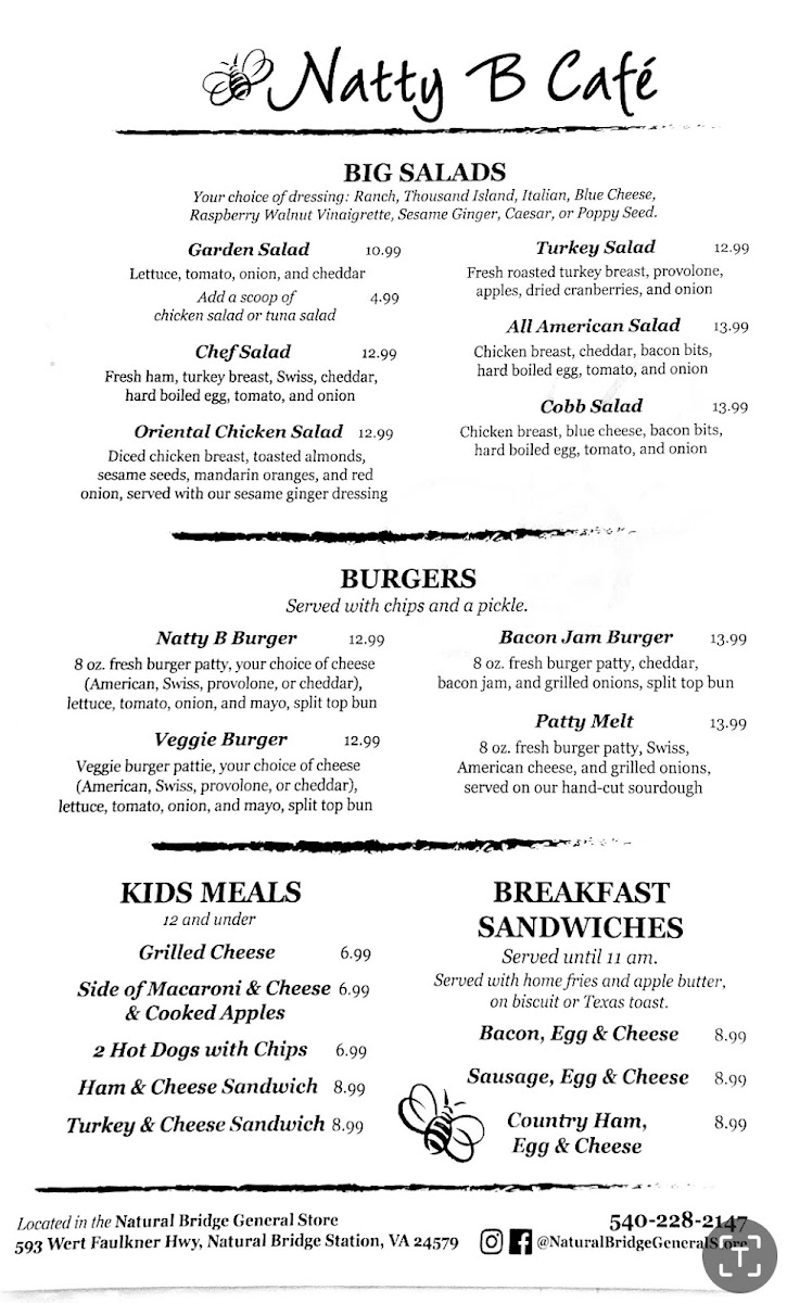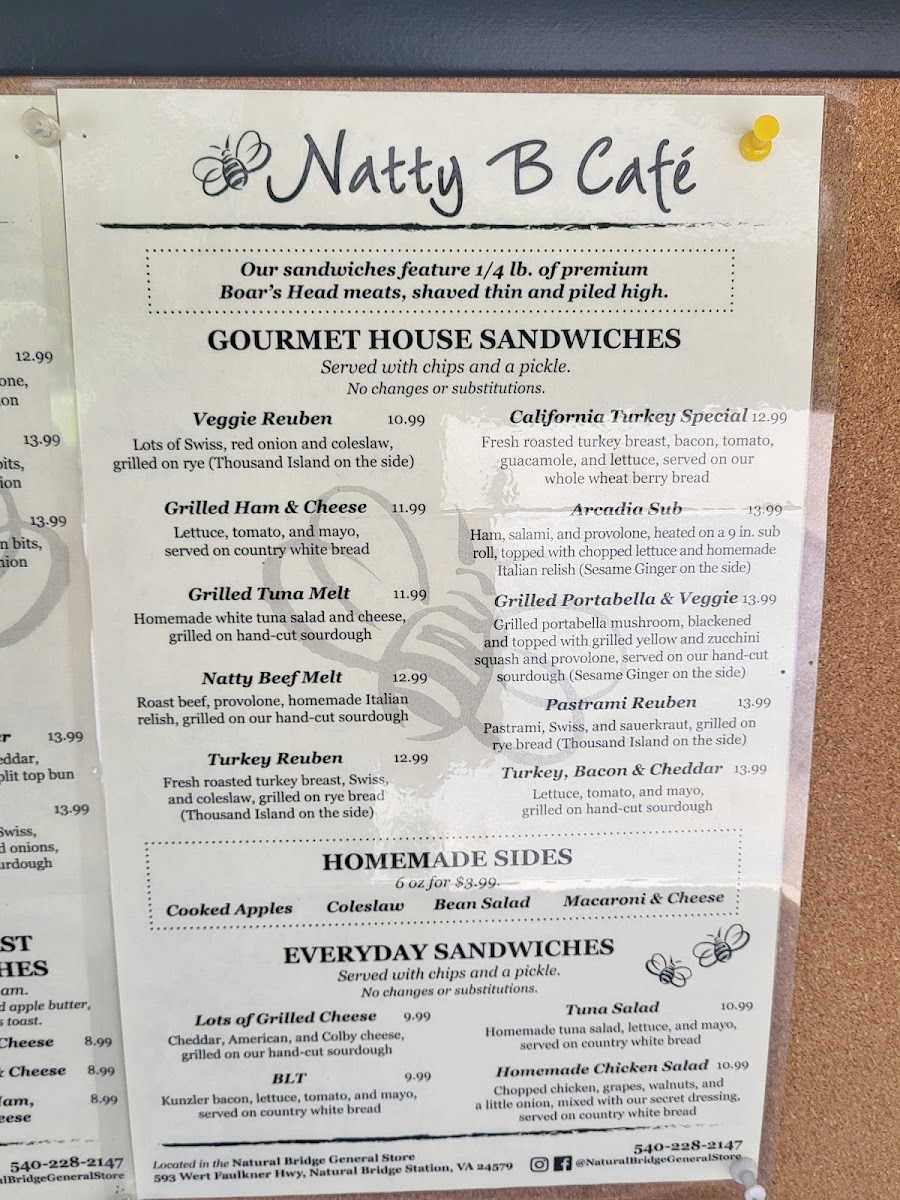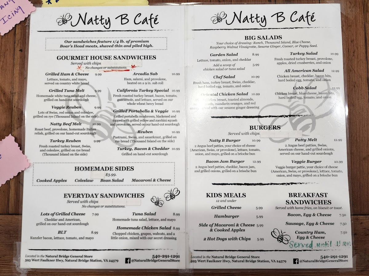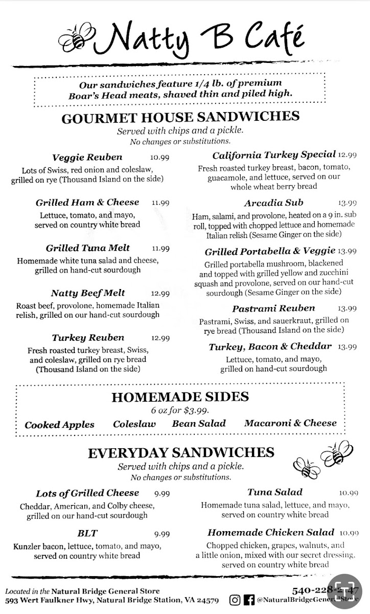 At the charming Natural Bridge General Store & Natty B Cafe, you'll discover a menu that celebrates comfort and quality. Set against the backdrop of Natural Bridge Station, VA, this café offers an array of gourmet house sandwiches like the Grilled Tuna Melt and the beloved Pastrami Reuben, praised for its incredible flavor and fresh ingredients. Salads are equally enticing, with options like the Chef Salad that's perfect for anyone craving a hearty meal. Breakfast lovers will delight in the mouth-watering sandwiches served until 11:00 am, complete with home fries and apple butter. Don’t forget to explore their selection of baked goods and local pantry staples, which include sauces and jellies. The welcoming atmosphere and attentive staff make this spot a must-visit. Here, every dish is a delightful testament to homemade goodness, inviting you to indulge after a day of exploring the nearby Blue Ridge Parkway.